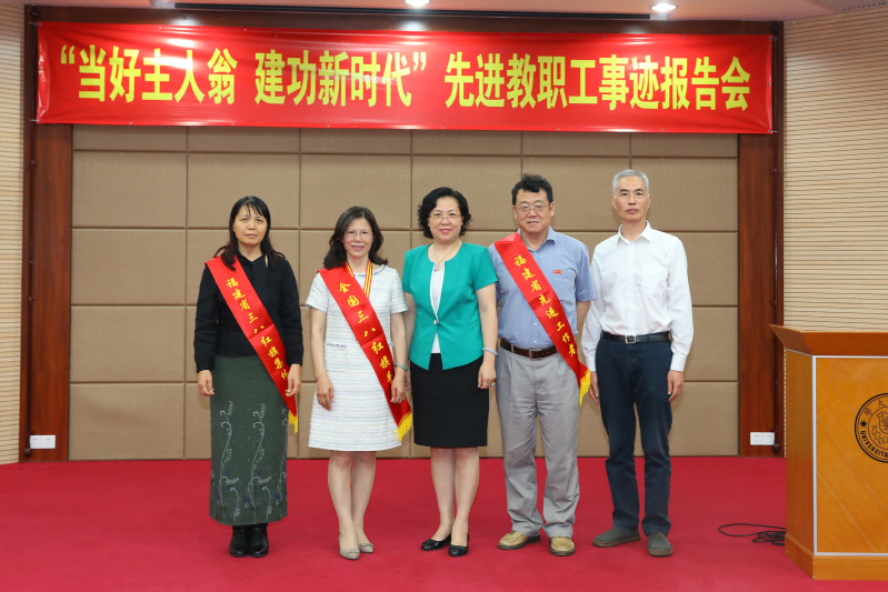 福建省先进工作者、物理与科学技术学院康俊勇教授,福建省三八红旗集体——国家级化学实验教学示范中心负责人任艳平教授,全国三八红旗手、校工会副主席、校妇委会主任、法学院蒋月教授依次上台发言,他们分别从个人、集体的角度,讲述了在各自岗位上不忘教书育人初心,牢记立德树人使命,用“能干+实干”、“匠心+爱心”践行习近平总书记关于“四有好老师 ”、“四个引路人”重要讲话精神,在三尺讲台上,为指引学生前进领航导向,在一方校园里,为培养祖国人才尽心尽力。