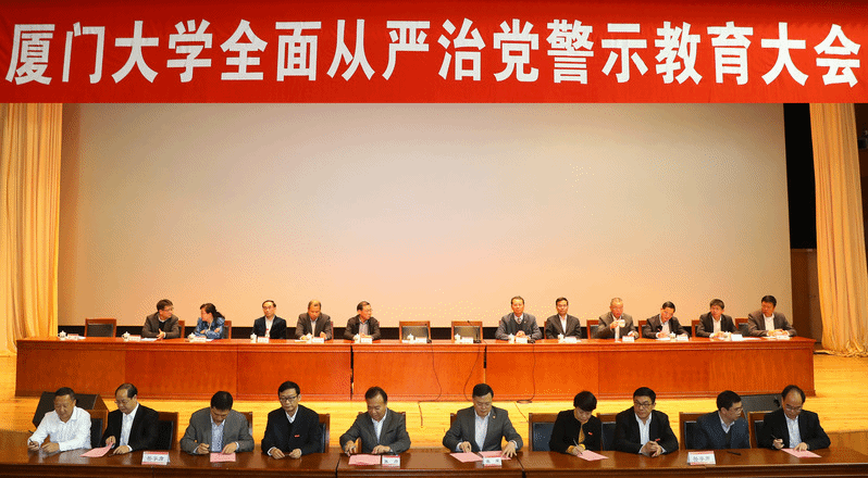 会上,张彦、张荣与各学院(研究院)、直属单位的党政领导班子主要负责人、机关部处和群团组织主要负责人签订了《中共厦门大学委员会落实全面从严治党主体责任责任书》。所有处级领导干部签署了《厦门大学处级领导干部廉政承诺书》。此外,与会处级以上领导干部还集体观看了纪律教育专题片《铁纪强军》。