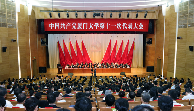 当天的会场洋溢着热烈、民主、团结、奋进的气氛。主席台上方悬挂着“中国共产党厦门大学第十一次党员代表大会”的会标,后幕正中是镰刀和锤头组成的党徽,10面鲜艳的红旗分列两侧,会场后面伫立的展板上书写着“奋进新时代,筑梦新征程,为加快建设中国特色世界一流大学而不懈奋斗!”的大幅标语。