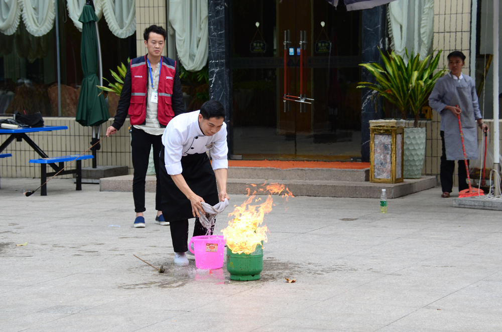 理论知识讲解完毕,餐饮部员工在教工广场进行了实际演练。在安全员的指导下,部门各岗位的员工轮流进行了燃气灭火的实际操作。安全员也逐一对参加演练的员工进行了详细规范的动作说明。理论与实践的相结合,使现场每一位员工在学以致用的同时,更加牢固了工作中安全生产的防范意识。