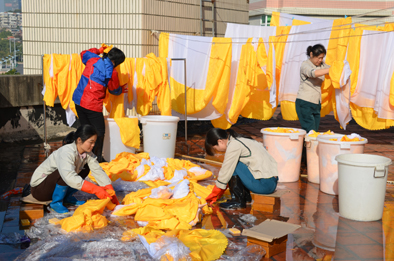 我们的窗帘,床裙也都是集中在这个时候清洗的,其实这些本可以送洗,但是为了节约资金成本和减少损耗,客房管理部的同志们都自食其力。阿姨们套起手套,挽起袖子在冷水中洗搓积累了一年污垢的窗帘床裙。而此时寒风凛冽,她们脸上却依旧挂满笑容。由此可见,敬业的理念,深入人心。