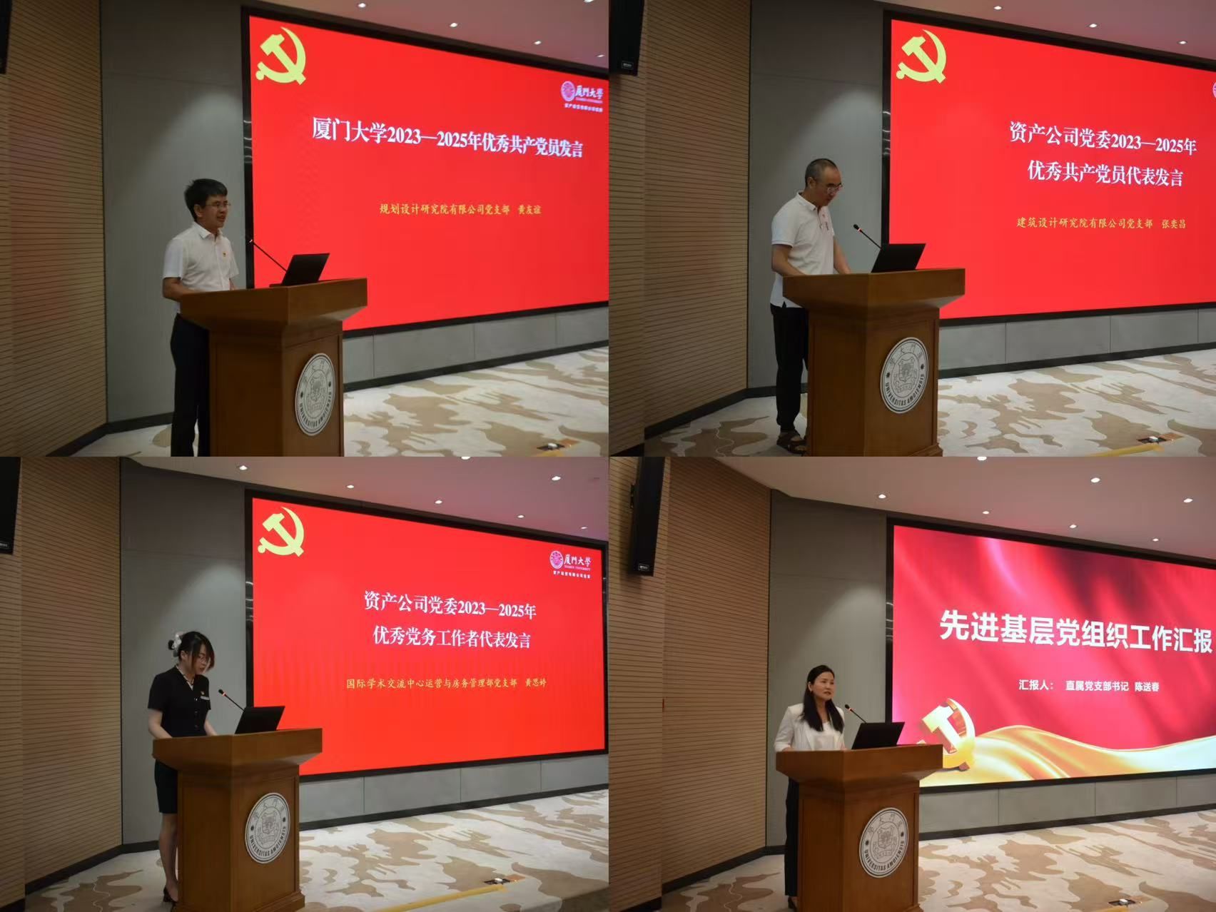 荣获学校党委表彰的优秀共产党员黄友谊及荣获资产公司党委表彰的优秀共产党员代表张弈昌、优秀党务工作者代表黄思婷、先进基层党组织代表陈送春分别发言。他们结合自身学习工作经历,用朴实的话语、生动的事例分享了基层党组织建设、团队管理及个人成长等方面的做法和经验,多角度展现了资产公司党委党建工作的丰富经验和良好成效。