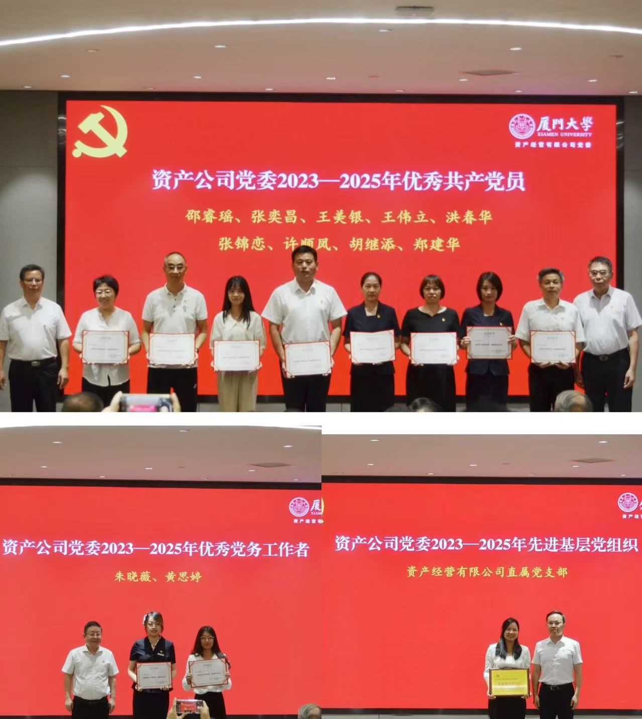 2025年7月2日下午,厦门大学资产经营有限公司党委(以下简称“资产公司党委”)庆祝中国共产党成立104周年暨2023-2025年“两优一先”表彰会在克立楼三楼报告厅召开。资产公司党委书记伍伟平,总经理兼产业技术研究院(以下简称“产研院”)院长沈小平等党政班子成员,资产公司党委原书记曾安、郑建华,“光荣在党50年”纪念章获得者苏镜华,资产公司全体在职职工党员、退休职工党支部书记、支部委委及退休职工党员代表、入党积极分子等参加表彰会。资产公司党委副书记陈伟主持会议。