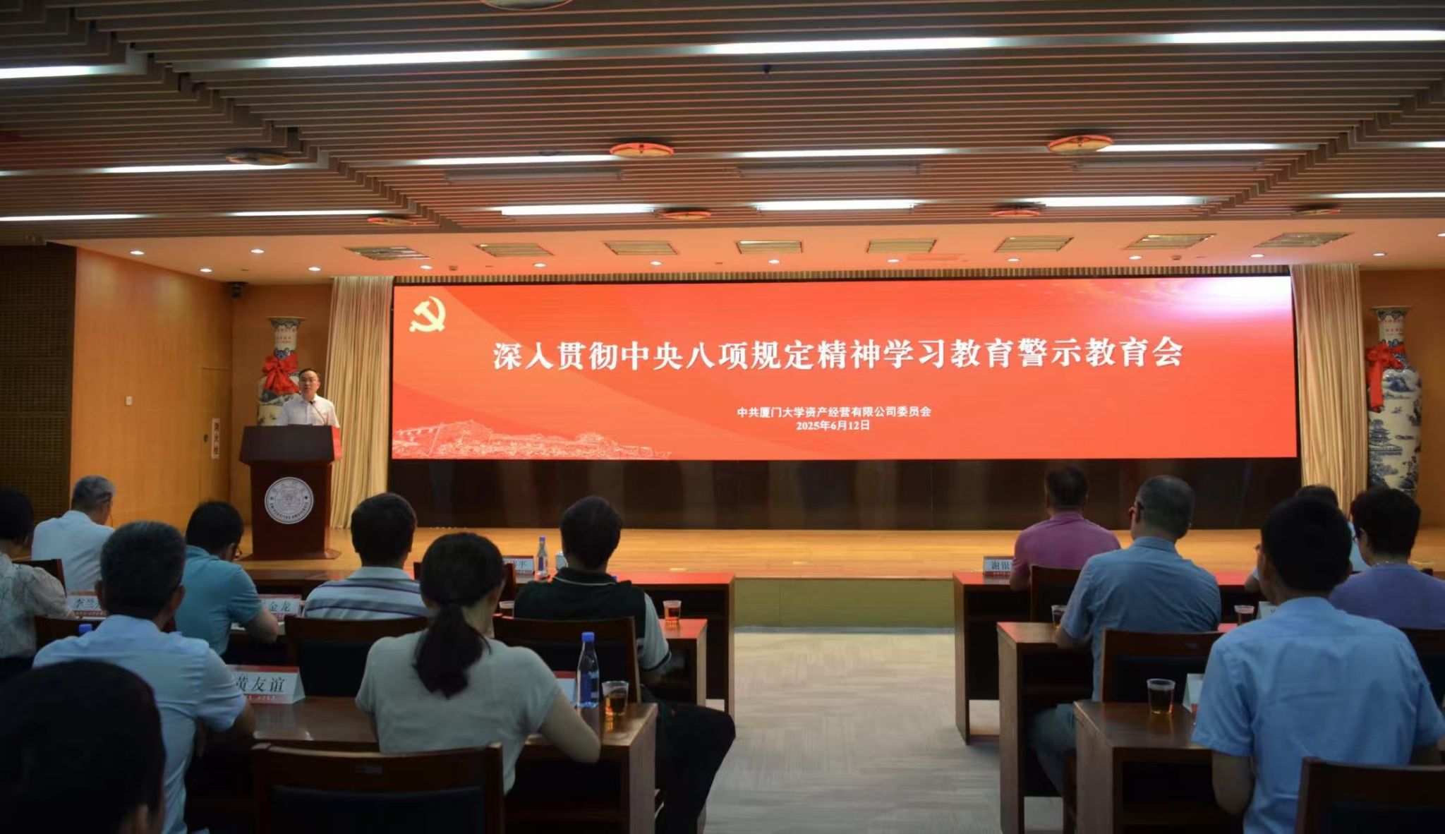 为深入学习贯彻习近平总书记关于加强党的作风建设的重要论述,推动学习教育走深走实,2025年6月12日上午,厦门大学资产经营有限公司党委(以下简称“资产公司党委”)召开深入贯彻中央八项规定精神学习教育警示教育会。资产公司、产业技术研究院(以下简称“产研院”)全体在职职工党员、退休职工党支部委员参加会议。校基层党建工作联络员谢银辉到会指导。资产公司党委书记伍伟平主持会议。