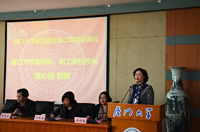 结业典礼在厦门大学校歌中拉开帷幕,副校长詹心丽首先发表了讲话。她对即将获得结业证书的学员和学校志愿者证书的学生志愿者教师,表示了由衷的祝贺,并对广大学员能够利用工作之余,克服困难、积极参与的学习精神进行了赞扬;对学生志愿者能够学以致用、回报学校表示感谢;对职工夜校管理委员会、校工会、校团委、国际学术交流中心、后勤集团等职工夜校组织单位的细致工作给予了充分的肯定。詹心丽提到,职工夜校要长久的办下去,使更多的职工能够利用厦门大学的良好平台,加强学习、提升学历、完善自我。她还就如何针对职工的工作范畴和兴趣爱好开展更实用的课程、如何让学员受益更多等方面,对职工夜校下一步的工作做出了部署,并提出了构建终身学习、终身教育体系的新要求。她还向广大学员寄予了“获得证书只是新的起点,要活到老,学到老、学无止境”的希望,同时鼓励学生志愿者更多的参与到教学实践中去,在实践中锻炼自己。最后,詹心丽向参加结业典礼的职工送上了新春的问候和祝福。