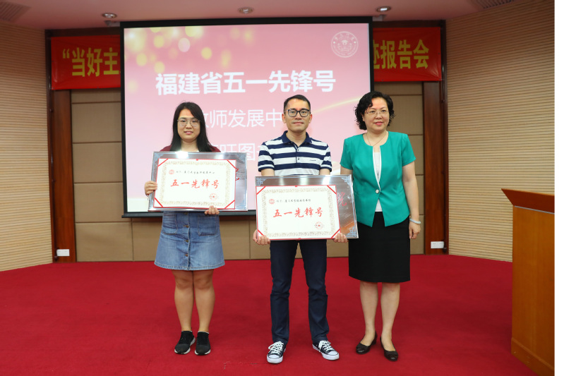 会上,邓朝晖首先为蒋月教授颁发 “全国三八红旗手”证书及绶带,为教师发展中心、德旺图书馆颁发“福建省五一先锋号”奖牌。