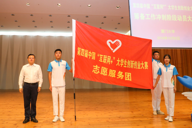 校长张荣向第四届中国“互联网+”大学生创新创业大赛志愿服务团代表授旗。