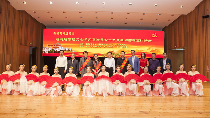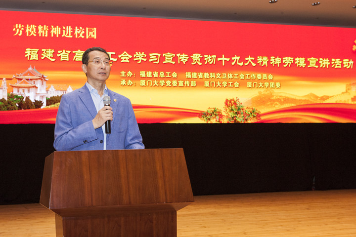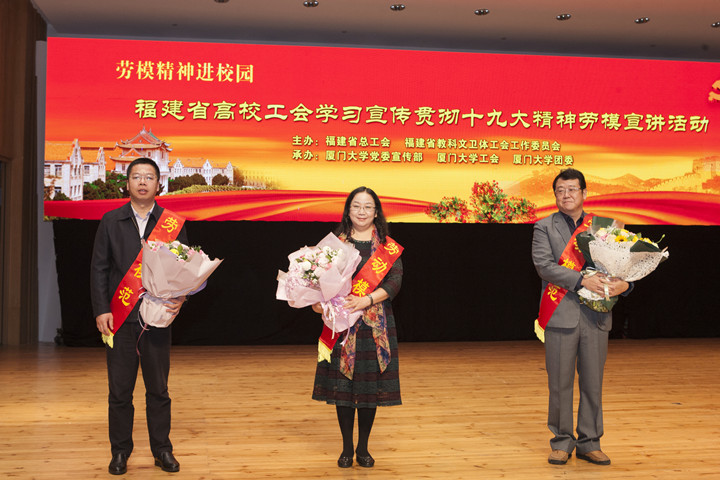 为了深入学习贯彻十九大精神,宣传工匠人才、弘扬劳模精神,11月29日上午,福建省高校工会学习宣传贯彻十九大精神劳模宣讲活动在科学艺术中心音乐厅举行。全国劳动模范、福建省总工会、厦门港务控股集团有限公司工会冯鸿昌副主席,厦门市劳动模范、物理科学与技术学院特聘教授康俊勇教授,厦门市劳动模范、法学院副院长李兰英教授,为现场的五百多名工会干部、师生代表做了场精彩的宣讲报告会。
