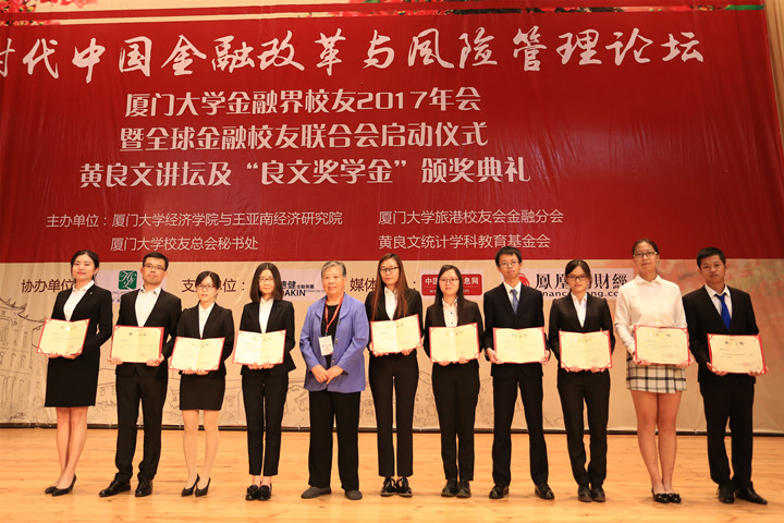 在“厦门大学金融界校友2017年会”召开之际,厦门大学经济学院统计系和黄良文统计学科教育发展基金会颁发了“良文奖学金”。黄良文统计学科教育基金会副理事长、中泰证券(上海)资产管理公司董事长章飙介绍了“黄良文讲坛”与“良文奖学金”的情况,黄良文教授夫人陈金菊为获奖者颁奖。中国人民银行参事吴国培作为特邀嘉宾参加了“良文奖学金”颁发仪式。