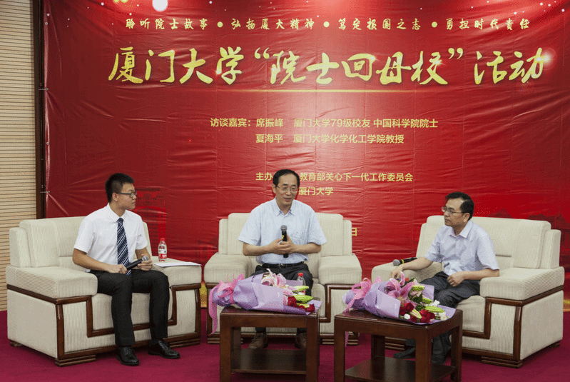在访谈环节中,席振峰院士与我校化学化工学院夏海平教授共同担任访谈嘉宾,他们回顾往昔,结合自身的教学、科研及生活经历,对于时下学生最为关心的大学生创新创业、大学生进实验室、升学与出国、科研成果与理念、中国力量等话题进行答疑解惑,并对习近平总书记在中央纪委七次全会上发表的重要讲话提到“四个统一”畅谈自己的理解。席振峰指出,他最牵挂厦大的恩师与美丽的校园,厦大化院教师秉承的低调、努力和坚持的科研态度值得敬佩,他坚持用“深新信”原则推动科学研究的“协同效应”。他表示,作为教师,应积极践行社会主义核心价值观,尤其是个人层面的爱国、敬业、诚信与友善,通过言传身教培养和影响下一代,形成教师愿意教、学生愿意学的良性互动。