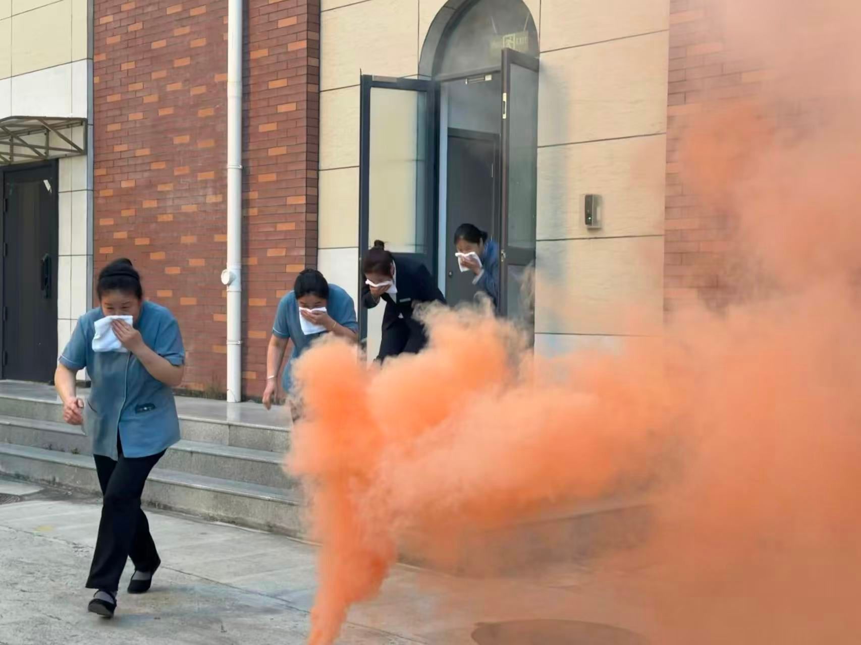 演练开始,模拟火情浓烟从蔡清洁楼一楼侧边涌出,并迅速向楼上蔓延。消防广播随即响起,循环播放疏散指令。参与演练的员工迅速反应,用湿毛巾捂住口鼻,低姿沿墙有序快速撤离。各楼层服务人员坚守岗位,沉着冷静指引疏散方向。微型消防站灭火搜救组全副武装,进入“火场”展开搜救。在多方高效协作下,生命通道被快速打通,人员疏散过程紧张有序。
