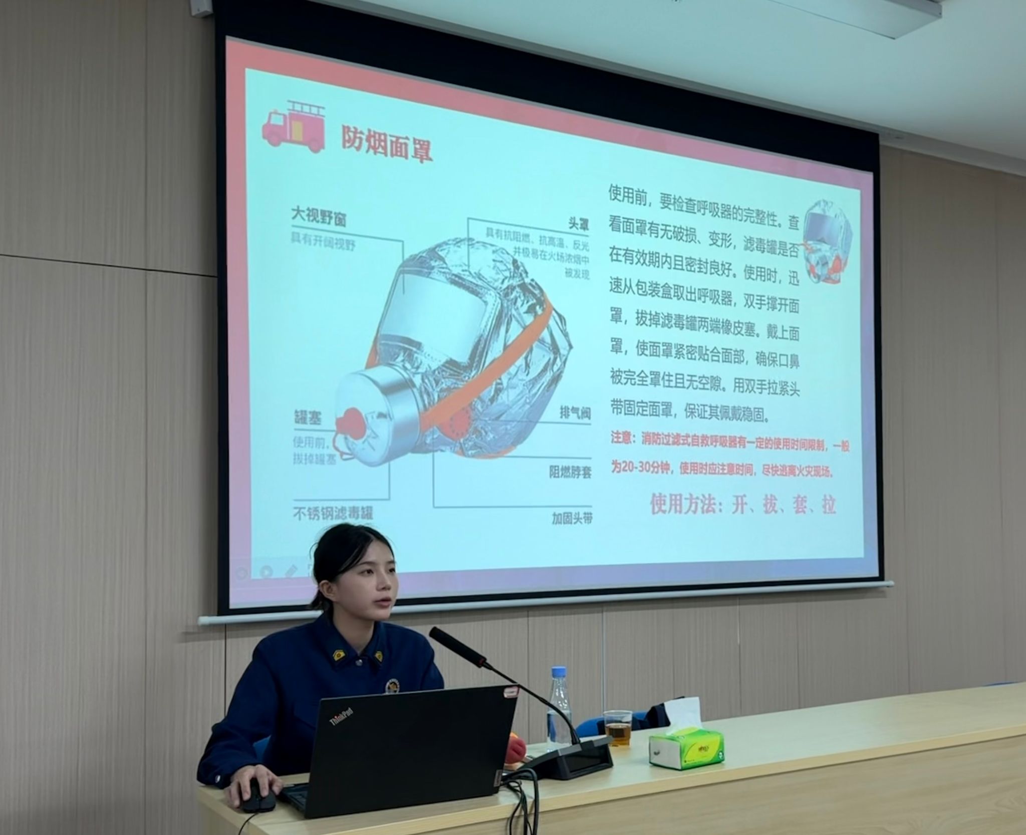 培训课上,消防大队宣讲员系统阐述了《中华人民共和国消防法》安全责任体系及应急处置流程,重点讲解并演示了防烟面罩的正确佩戴方法。通过讲授与实操相结合的方式,帮助参训人员掌握关键操作要点,切实提升消防安全意识与实战技能。