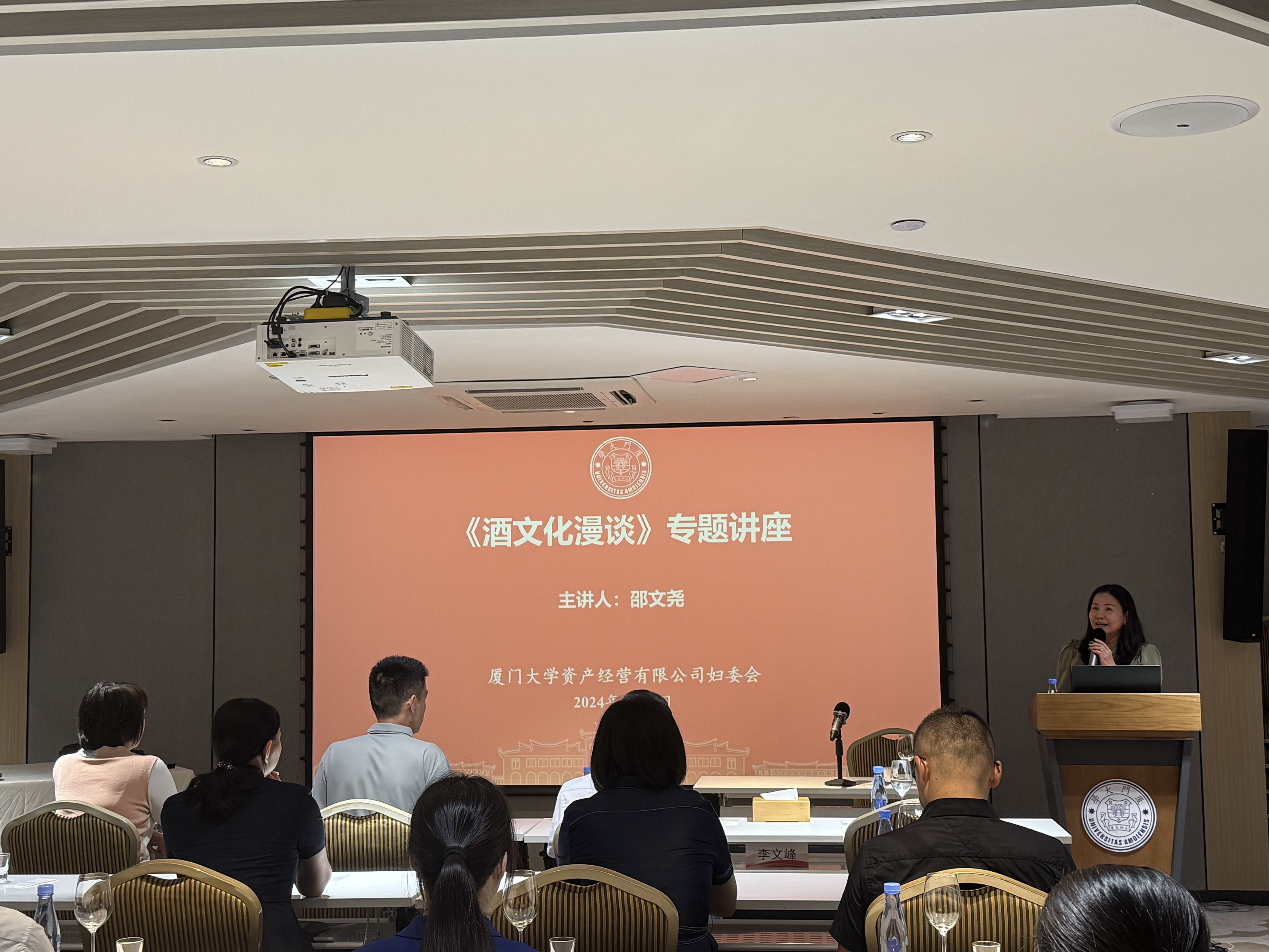 2024年11月1日晚,在思明校区克立楼二楼1号会议室,“厦园精酿”团队邵文尧老师带领资产经营有限公司(以下简称“资产公司”)所属成员企业的员工一同走进“酒文化”的世界,感受中华文化的博大精深,共同推进产学研用协同发展的探索与实践。专题讲座由资产公司妇委会主任陈送春主持。
