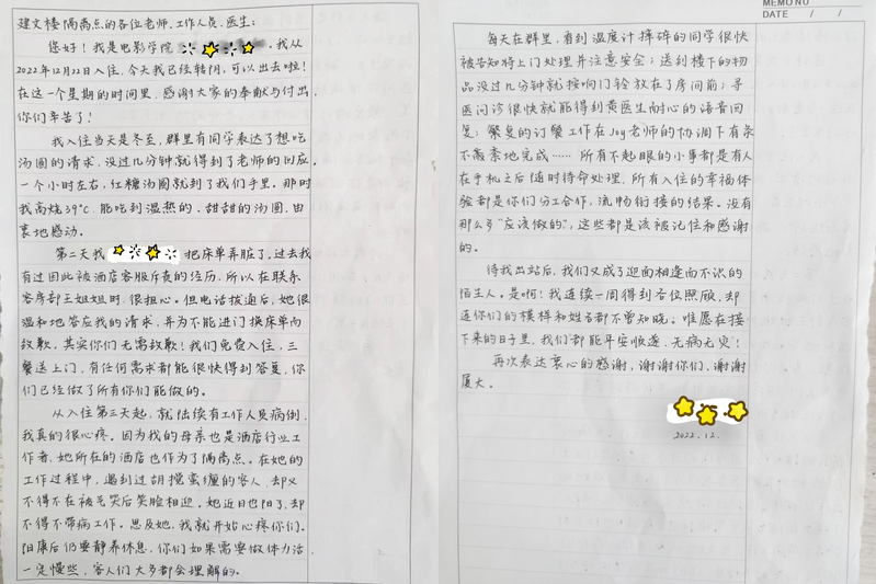 “我是电影学院的一名学生,感受到你们是一个有爱心、有敬业精神、有专业能力的团队,谢谢你们的悉心照顾……”不久前,中心收到一封感谢信,字里行间表达着对医护人员和工作人员的感激之情。