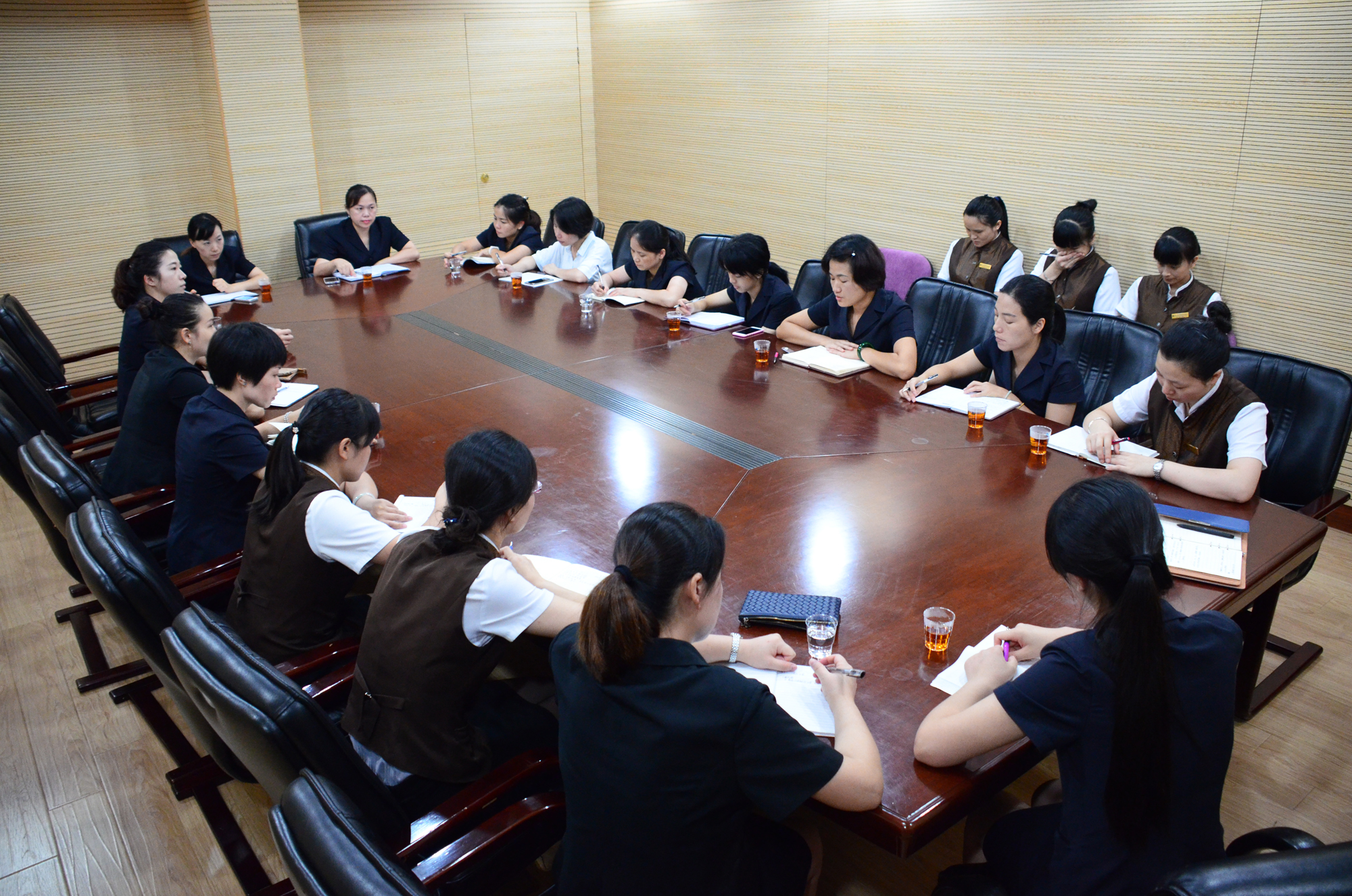 会议共分为“中心”内审工作总结,暑期工作计划,学校务虚会服务及管理员培训四个部分进行。“中心”内审工作小组成员、客房管理部高管洪梅雪,首先向在座管理员介绍了刚刚结束的“中心”2016年度内部审核工作的基本情况与总结报告,并通报了内审工作小组在检查楼层与客房时发现的几个问题。部门副经理郭小燕进行了点评与补充,强调管理员“要加强对新入职员工的培训工作,牢记薄弱环节、绷紧弦,以严肃、积极的态度面对9月份将要进行的外审工作”。随后,咖啡厅、漳州校区、翔安校区管理员分别对所负责辖区上半年的工作情况进行了汇报,同时阐述了针对即将开始的暑期所做的工作计划。