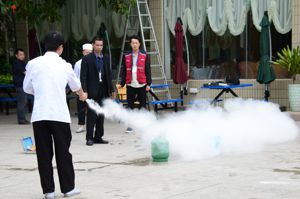 理论知识讲解完毕,餐饮部员工在教工广场进行了实际演练。在安全员的指导下,部门各岗位的员工轮流进行了燃气灭火的实际操作。安全员也逐一对参加演练的员工进行了详细规范的动作说明。理论与实践的相结合,使现场每一位员工在学以致用的同时,更加牢固了工作中安全生产的防范意识。