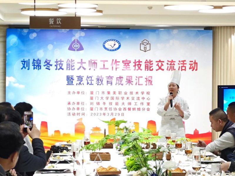 3月29日傍晚,中心携手厦门集美职业技术学校,以“刘锦冬技能大师工作室”为平台,依托厦门市烹饪协会西餐烘焙分会,云集厦门各大星级酒店西厨,展开一场精彩纷呈的技艺切磋。厦门市食品安全工作联合会秘书长刘伟程,厦门市旅游协会党委书记汪沂增,厦门市职业技能鉴定中心竞赛科兰卫林,厦门市职工服务中心技术培训部部长张大伟,集美区教育受理中心副主任、集美区教育局德育科负责人汪乐萍,厦门市集美职业技术学校副校长张波,厦门大学国际学术交流中心党总支书记陈伟,总经理黄镭及餐饮等相关部门负责人参加活动。活动由刘锦冬主持。